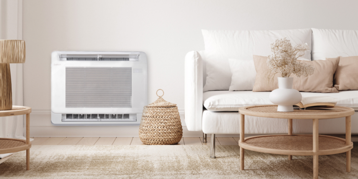 Diskret golvmodell med dubbelt luftuttag, tyst drift och effektiv värme ned till -25 °C – perfekt för nordiskt klimat.